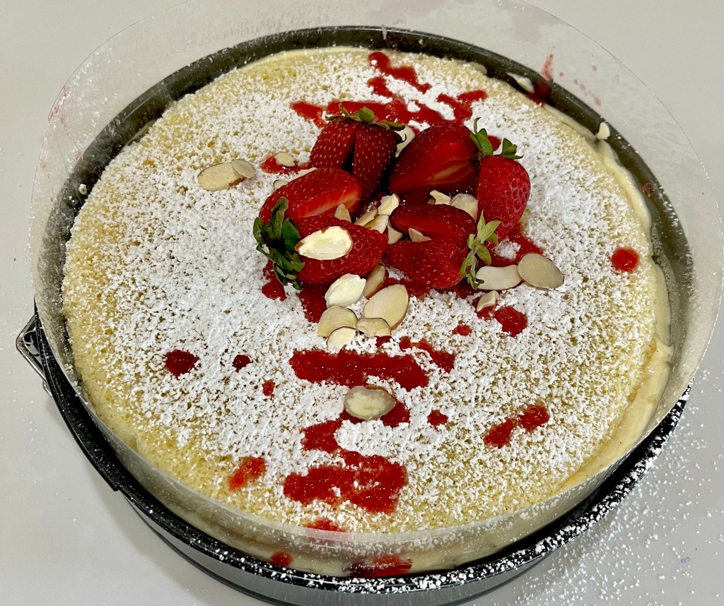 Add some slices of fresh strawberries in the centre of the cake with fresh mint leaves and flaked almonds.