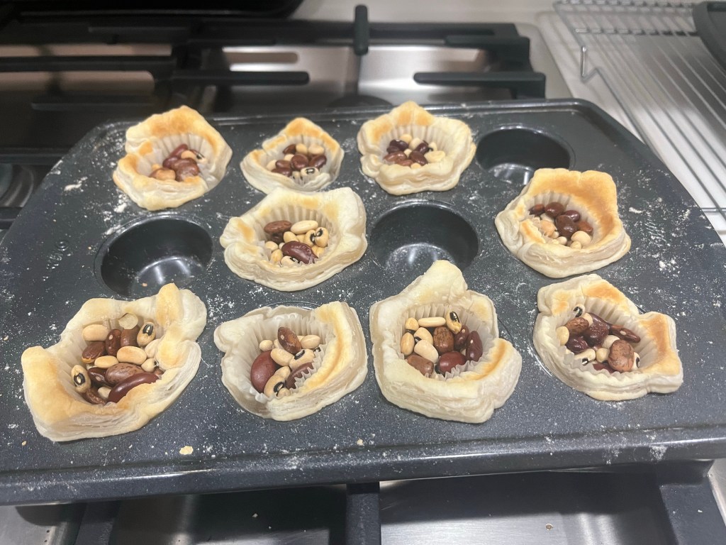 Pastry in pan with cupcake papers and beans“Sandwiched” puff pastry, cupcake papers, beans and second cupcake panBaked puff pastry