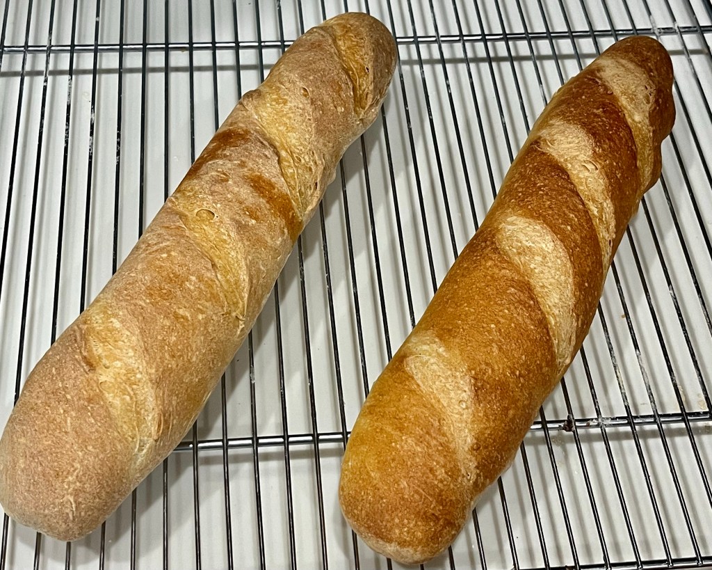 - Bake the baguettes — on the pan, or on a stone — for 24 to 28 minutes, or until they’re a very deep golden brown. Remove them from the oven and cool them on a rack. Or, for the very crispiest baguettes, turn off the oven, crack it open about 2″, and allow the baguettes to cool completely in the oven, until both baguettes and oven are at room temperature.