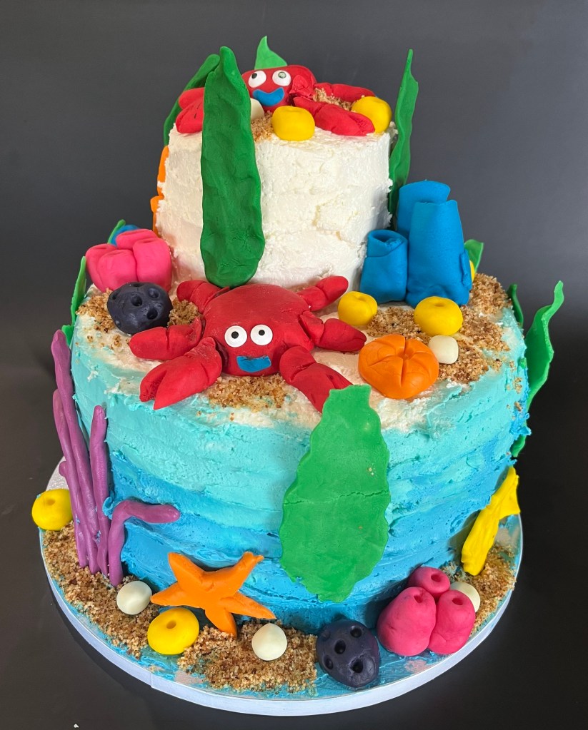 The fondant is basic marshmallow fondant, but a lot of it. I needed it to be 16×25” to cover the cake. One issue I had was the fondant was drying out as I kneaded and rolled it out. (Next time, don’t make it 2 days in advance.)