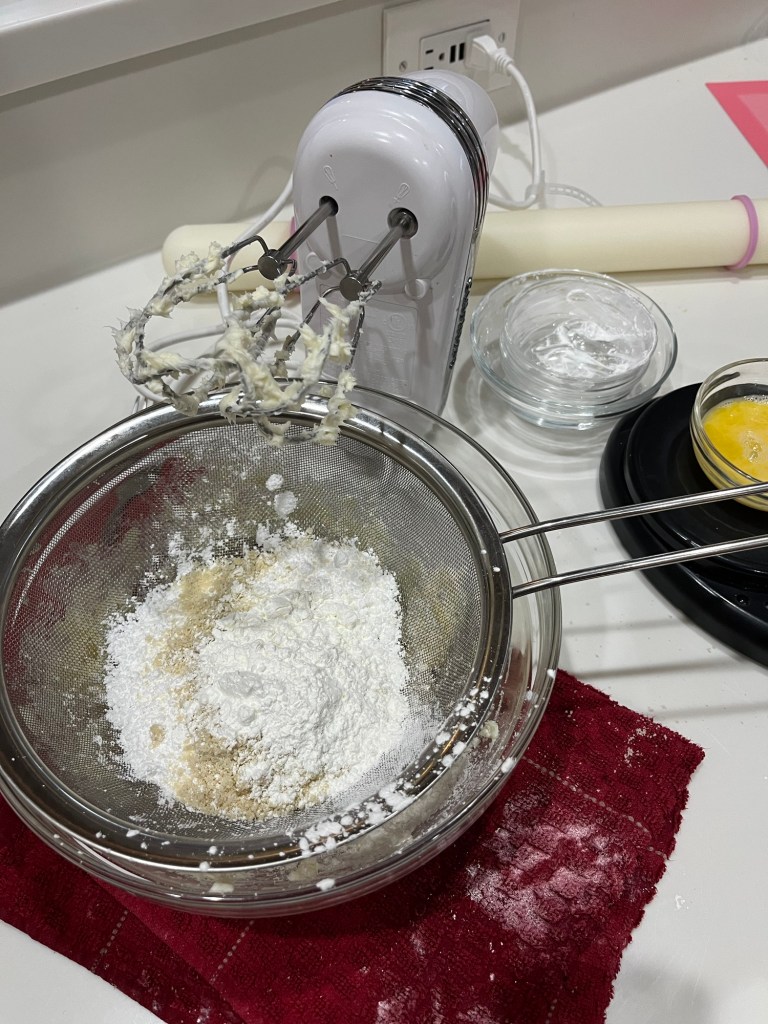 - Sift in powdered sugar, almond powder and corn starch. Beat lightly. Add the room temp. eggs gradually and mix. Finally, add in the cake flour and mix well.