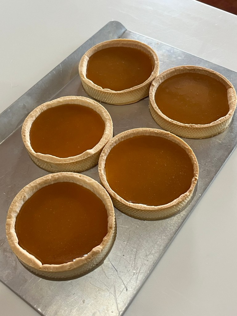 - Bake 3mm crust at 340⁰F for 10mins, take the pie weights out, then bake for another 5 mins. (320⁰F for 2mm)