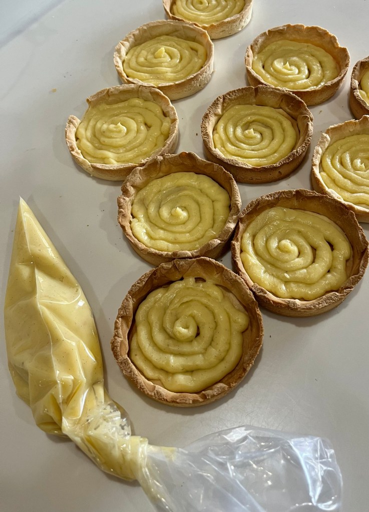 - Pipe a ¼” layer of crème patisserie layer into each tart shell and smooth while the crème patisserie is still warm. Let set before proceeding.