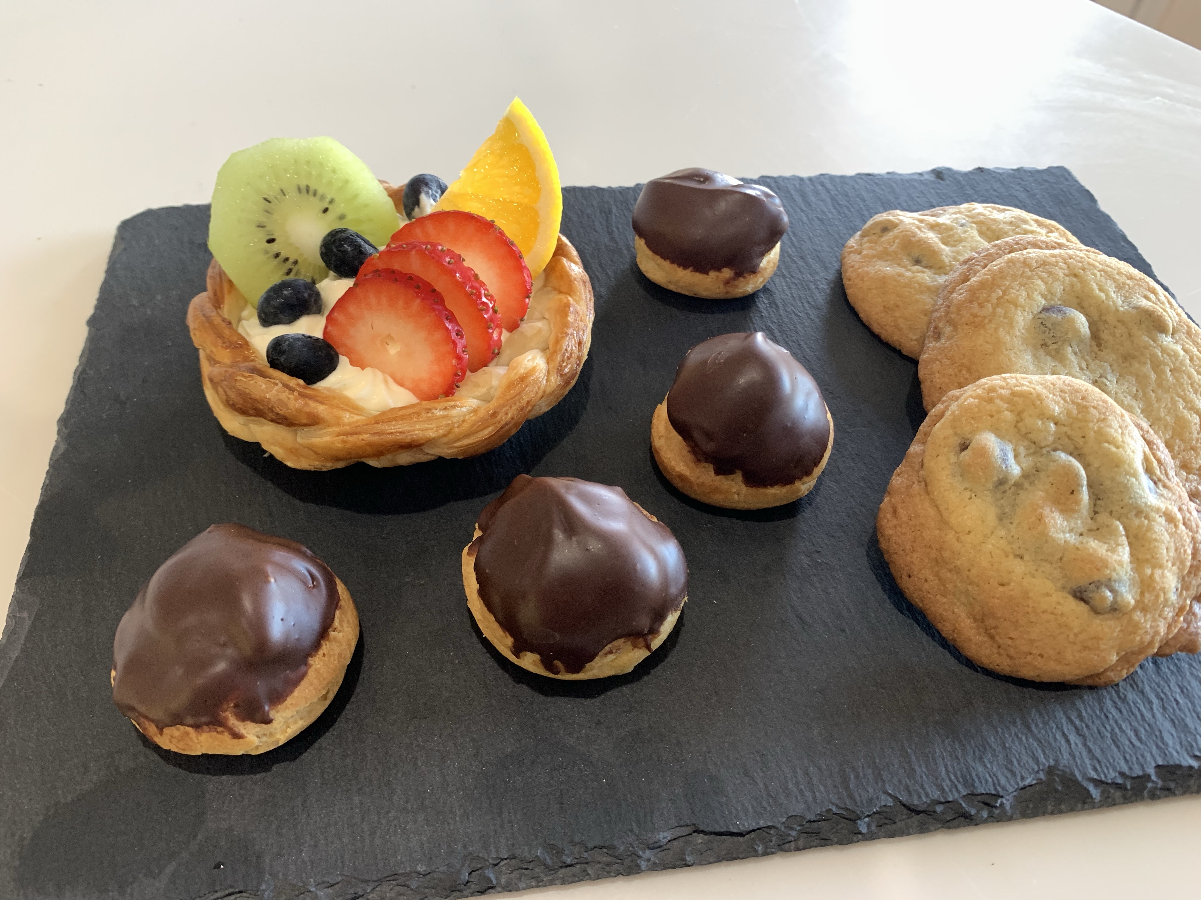 From front to back are” Snowflake Bread, fig newtons and raspberry filled profiteroles, chocolate glazed chocolate filled chocolate tarts with a croustillant layer and finally gingerbread millionaires bars.