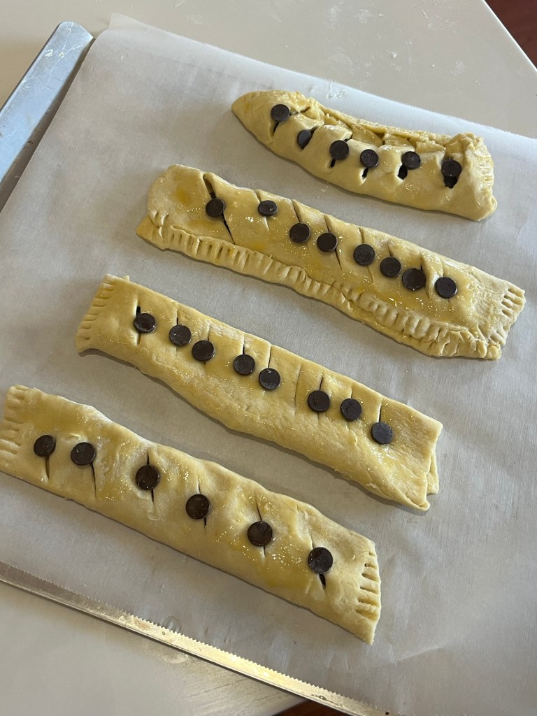 - Spread cream cheese on 1½” x 4” edge of the rectangle, being careful not to coat the edges of the pastry.