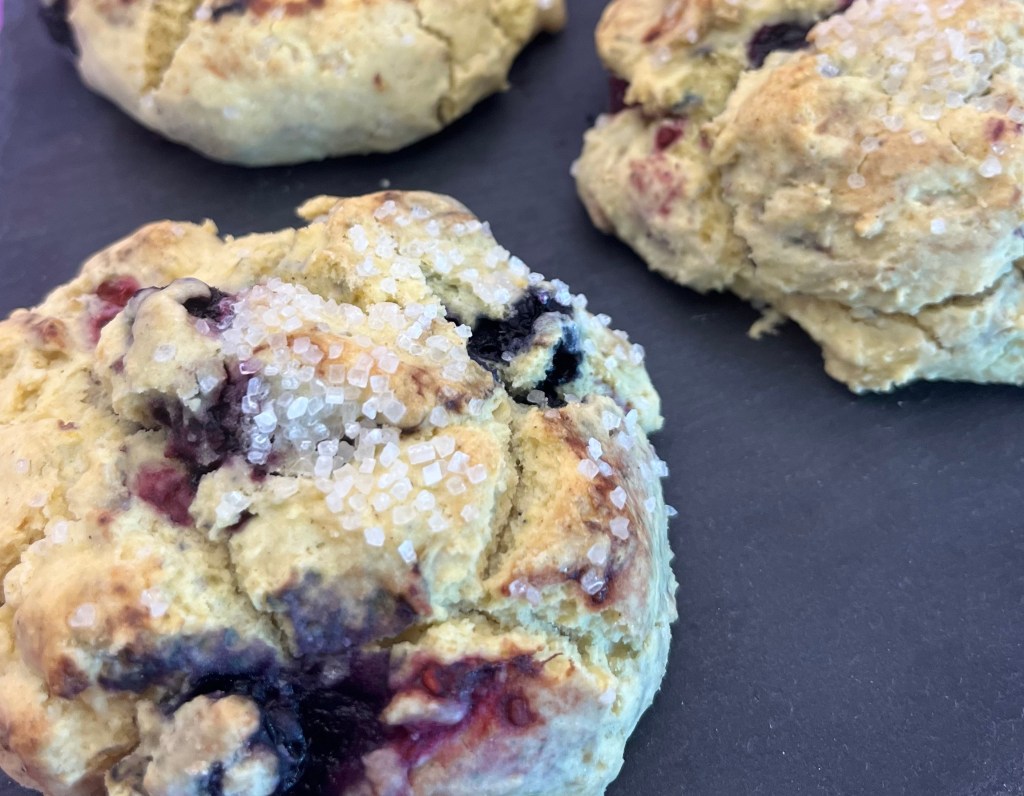 This is my go -to recipe for any variety of berry scones. (These are my favorites.) They are also great to freeze and when the urge hits, thaw on the top of a toaster.