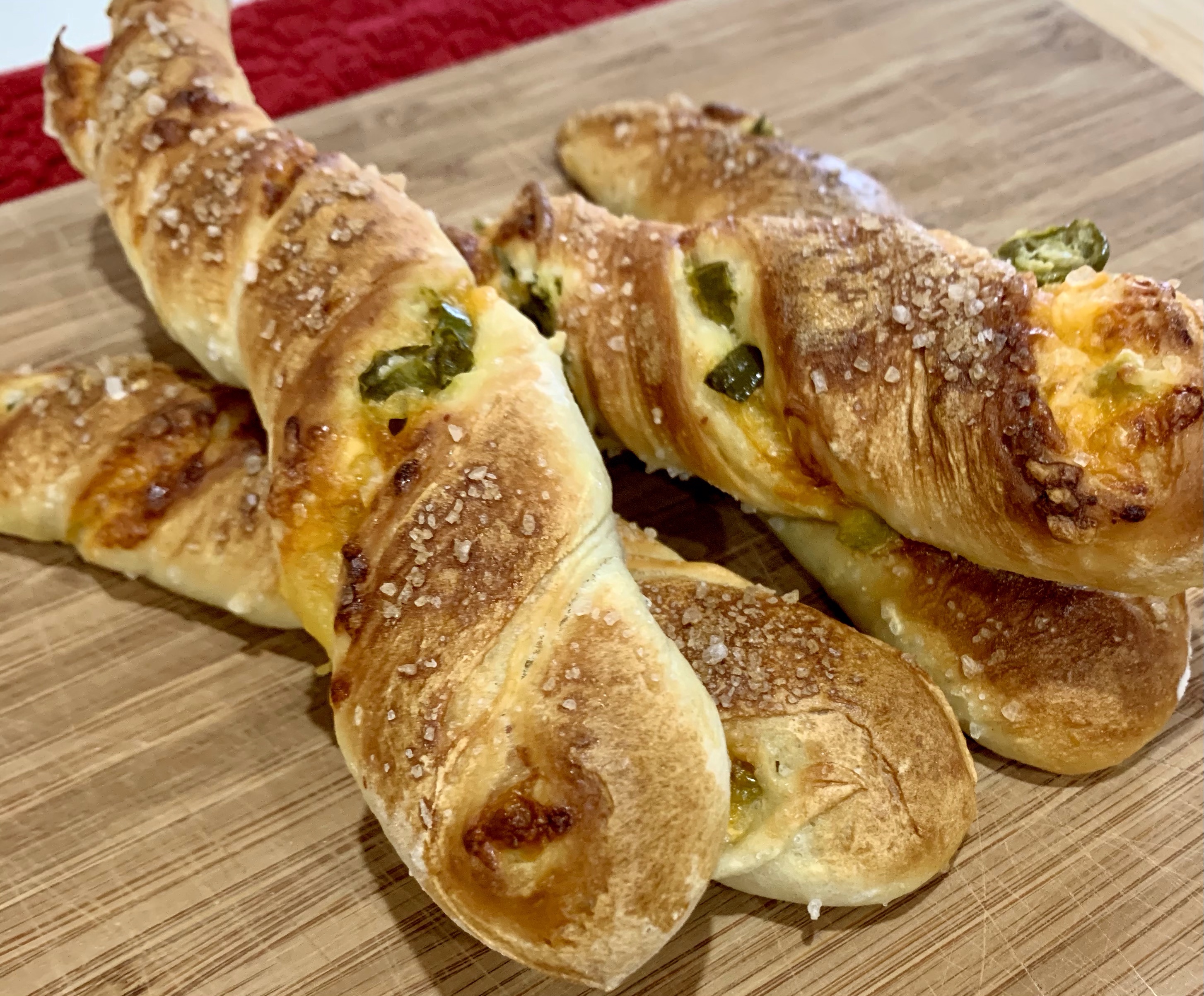 I made some Olive Bread Sticks a few days ago which quickly disappeared. To follow up, I decided to design a recipe for Cheese and Jalapeño Bread Twists. I used a basic 80% hydration dough and Frances’s home made pickled jalapeños.