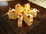 I didn’t have a rectangular cake board of the appropriate size (13”x17”,) nor did the local stores, so I made one from cardboard and food quality cellophane.